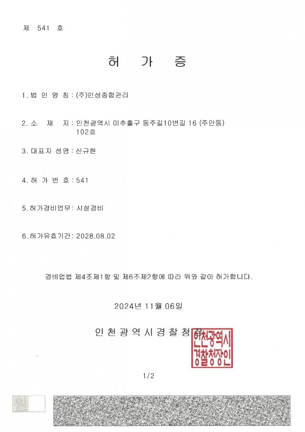 인성종합관리경비허가증 페이지 정보 작성자 최고관리자 댓글 0건 조회 76회 작성일 25-04-01 09:27 본문 인성종합관리경비허가증 목록 다음글인성종합관리 영업신고증 25.04.01